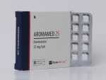 Aromamed 25mg contains the active ingredient: Exemestane. It is classified as an aromatase inhibitor medication. Exemestane is commonly used in the treatment of breast cancer, particularly among postmenopausal women whose cancer has advanced despite prior hormonal therapies. it’s also known for significantly reducing the risk of breast cancer in high-risk women.